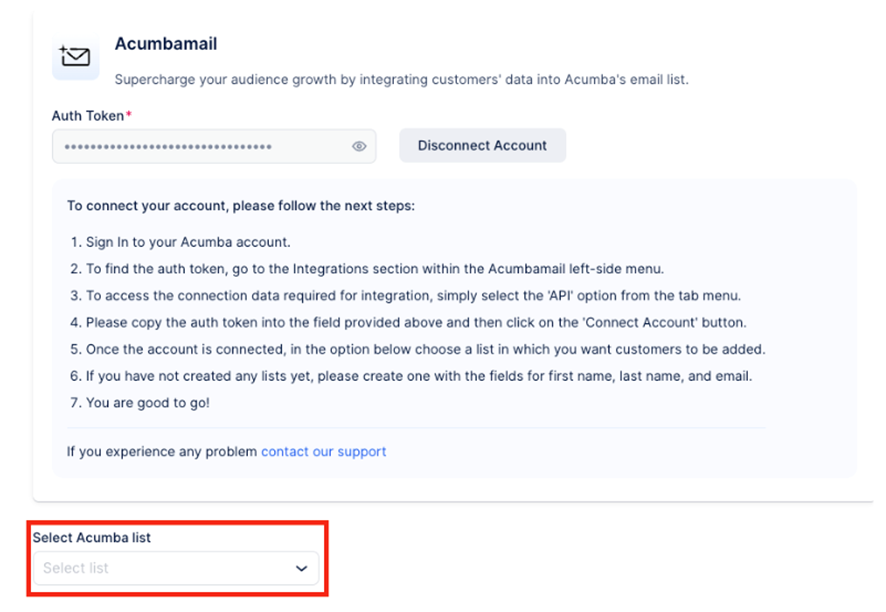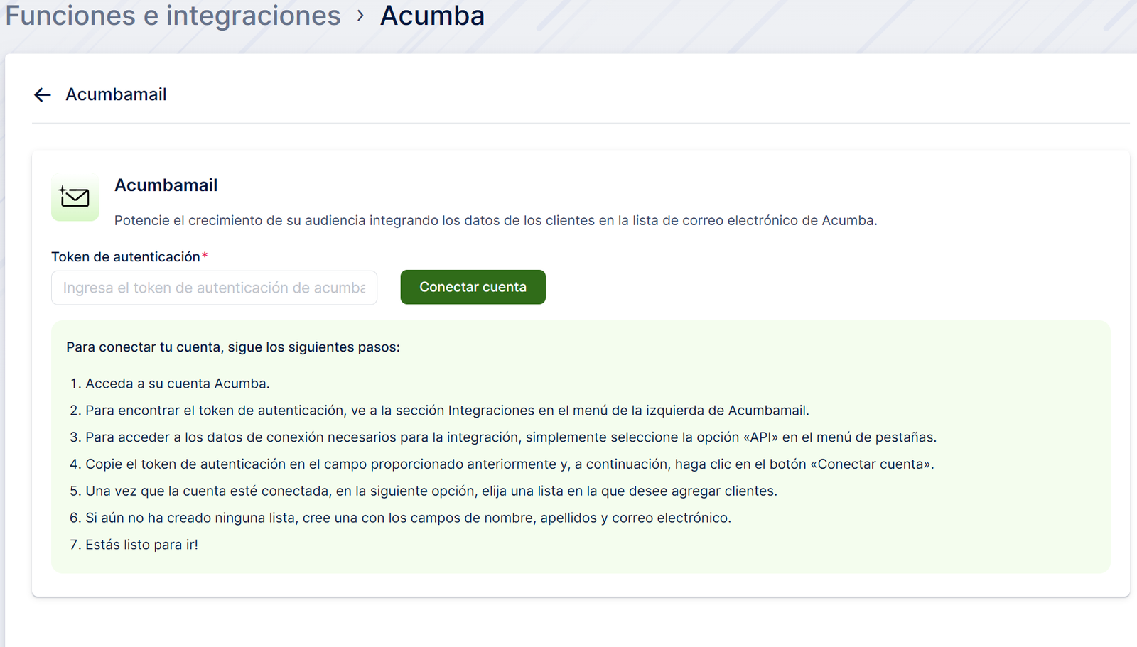 A continuación, se abrirá una nueva página con instrucciones sobre cómo vincular su cuenta de Acumbamail. Deberá agregar el token de autenticación de Acumbamail y hacer clic en «Conectar cuenta» para iniciar el proceso de configuración.