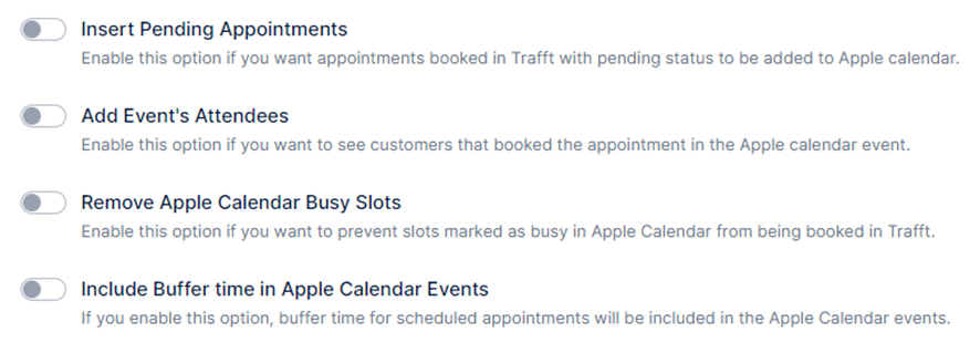 Insertar citas pendientes: al habilitar esta opción, se crearán eventos del calendario de Apple para todas las citas con el estado Pendiente (las citas con el estado Aprobado se agregan automáticamente, no hay forma de cambiar esto).