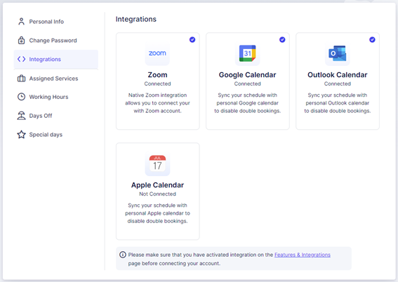 En esta sección puedes conectar Zoom, Google Calendar, Apple Calendar y Outlook Calendar con tu cuenta de CnB. Otros usuarios también contarán con esta opción si el administrador ha activado estas integraciones en la página de Funciones e Integraciones.