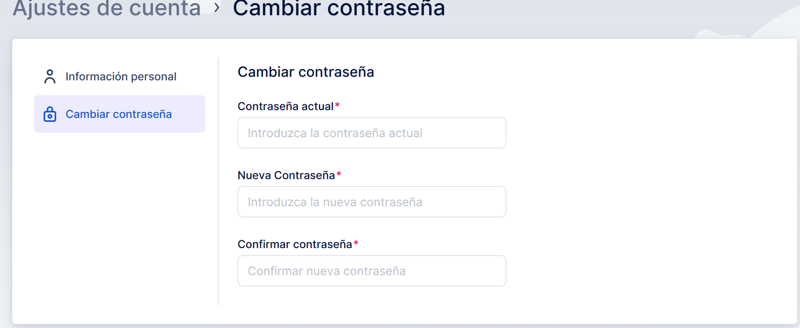 Aquí puedes actualizar la contraseña que configuraste durante el registro. Para ello, ingresa tu contraseña actual, luego la nueva contraseña y, por último, confírmala ingresándola nuevamente.
