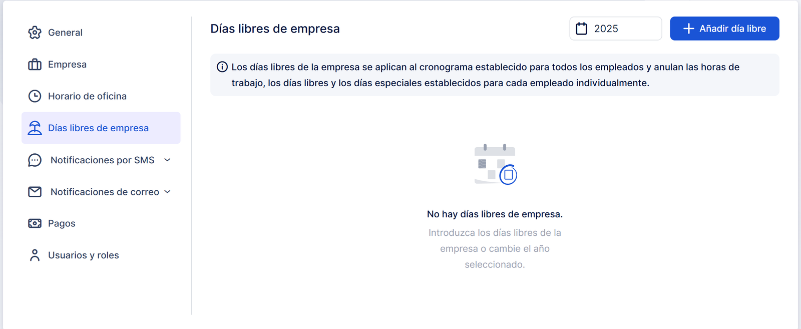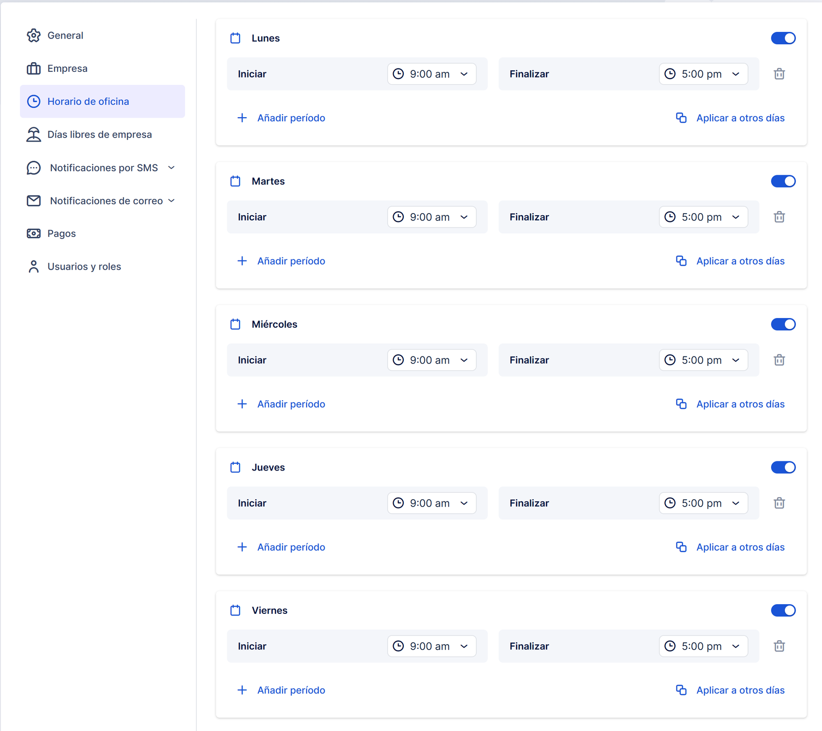 Si está habilitada en la sección de Funciones e Integraciones de Reservify, esta opción aparecerá en la Configuración de la Cuenta. En este apartado, puedes configurar días laborales especiales que no sigan el horario estándar.