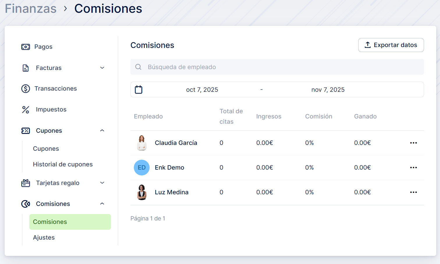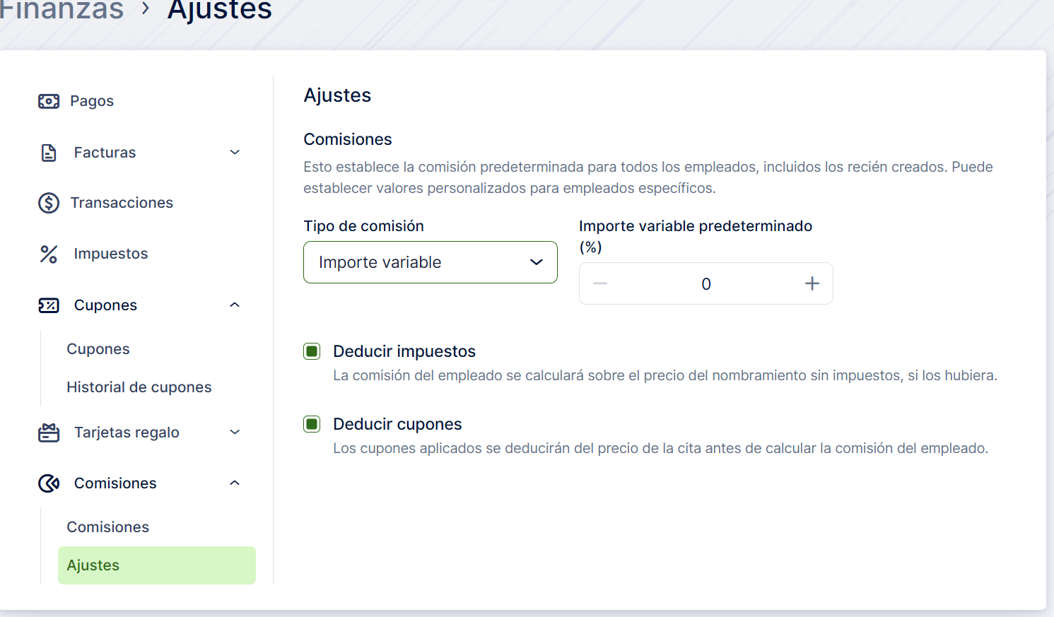 En la pestaña Configuración, podrá establecer una tasa de comisión predeterminada para todos los empleados existentes y recién creados.