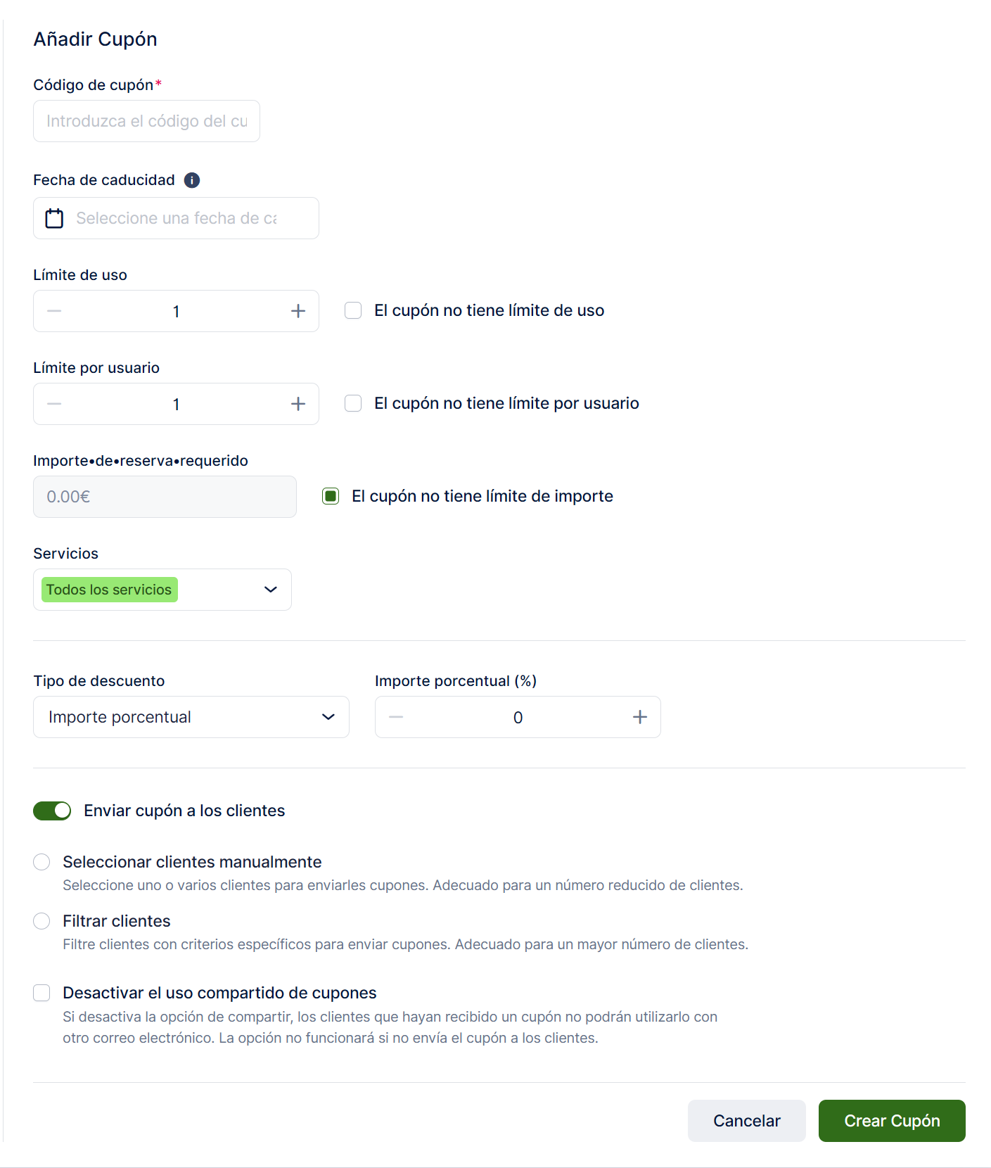 - Seleccionar clientes manualmente: elija clientes específicos a los que enviar el cupón. Una vez seleccionado y guardado, el cupón se enviará por correo electrónico a estos clientes.