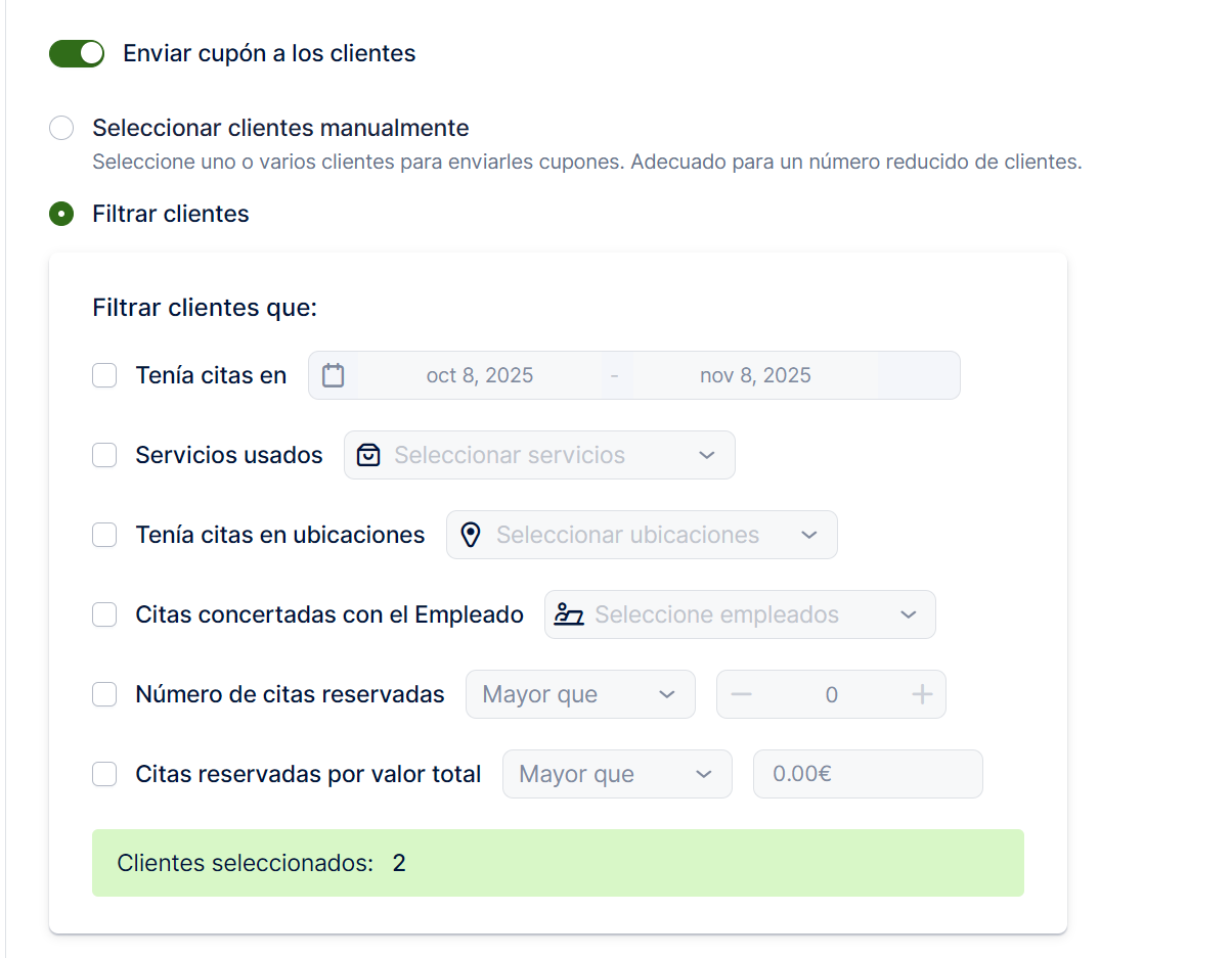 - Filtrar clientes: seleccione los criterios para enviar el cupón a los clientes que: