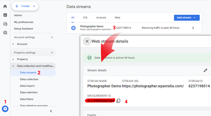 Accede a tu página de Google Analytics 4 y haz clic en el icono «Admin» (Gear) situado en la esquina inferior izquierda. A continuación, vaya a «Recopilación y modificación de datos» y luego a «Flujos de datos«. Aquí encontrará sus flujos de datos existentes. Haga clic en su flujo específico para ver y copiar el ID de medición: