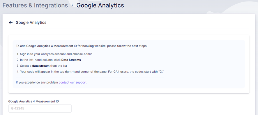 Después de habilitar la integración, la tarjeta se actualizará para mostrar un botón «Configurar«. Al hacer clic en este botón, se abrirá una nueva página con instrucciones sobre cómo encontrar su ID de medición de Google Analytics 4 (ya cubierto anteriormente) y con un campo donde puede pegarlo.