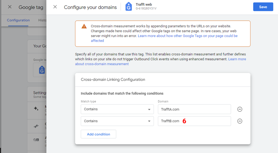 Paso 4: Ingrese todos los dominios que deben incluirse en la configuración de seguimiento entre dominios y luego haga clic en «Guardar» en la esquina superior derecha: