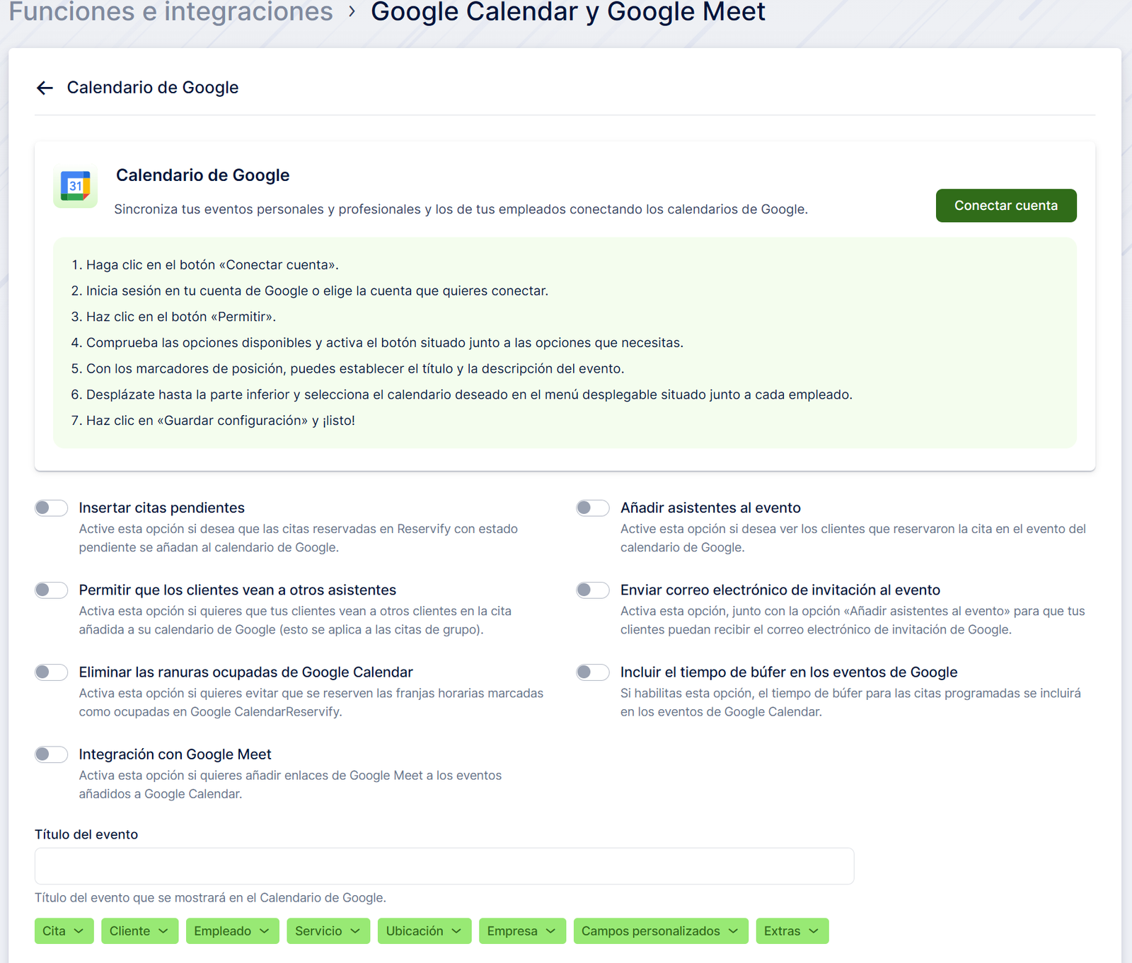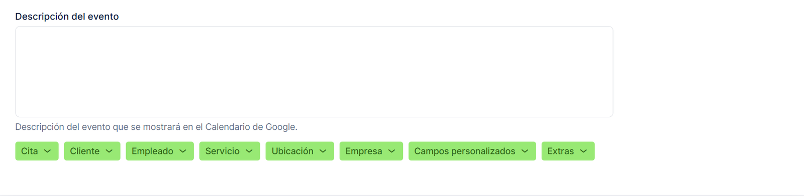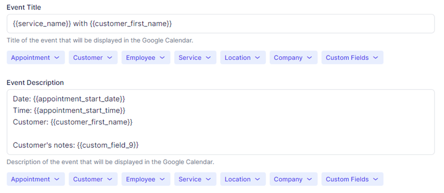 Una vez que conectes la cuenta a través de la página principal de configuración de Google Calendar, todos los empleados que hayas creado aparecerán debajo de la sección Título del evento y Descripción del evento: