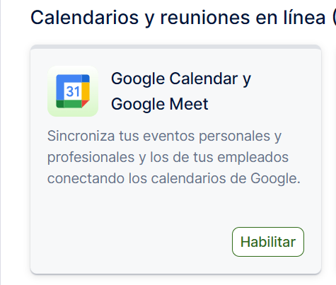 Para habilitarlo, vaya a la sección Características e integraciones dentro de Reservify. Localiza la integración de «Google Calendar y Google Meet» y actívala con un simple clic en el botón «Habilitar«.