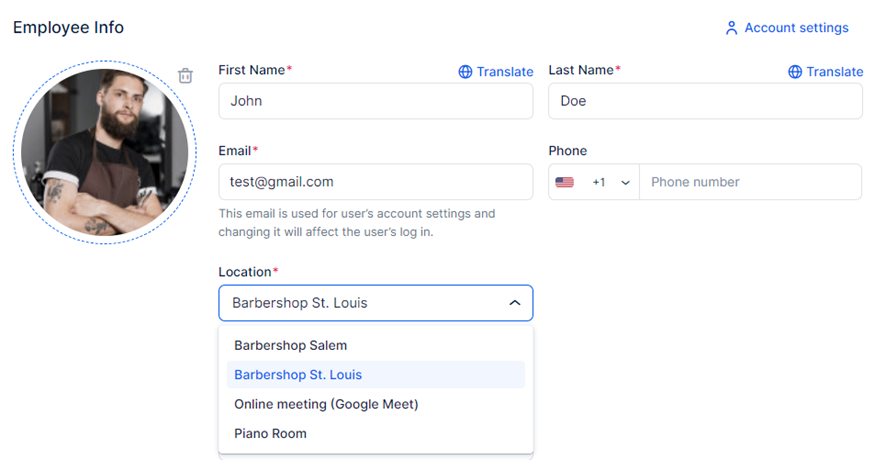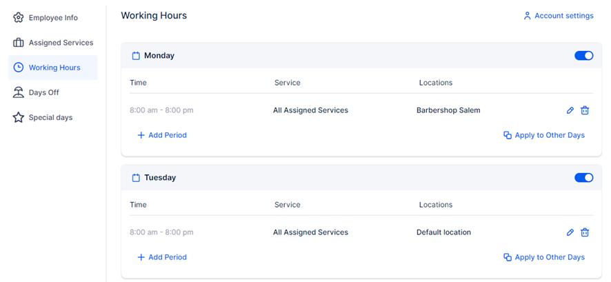 En este caso, el empleado cubrirá la ubicación predeterminada (Google Meet) los martes, pero el lunes está configurado para la ubicación «Barbershop Salem». Recuerde que puede seleccionar varias ubicaciones durante el horario laboral del empleado y que puede crear varios períodos de trabajo para que el empleado cubra diferentes ubicaciones por período.