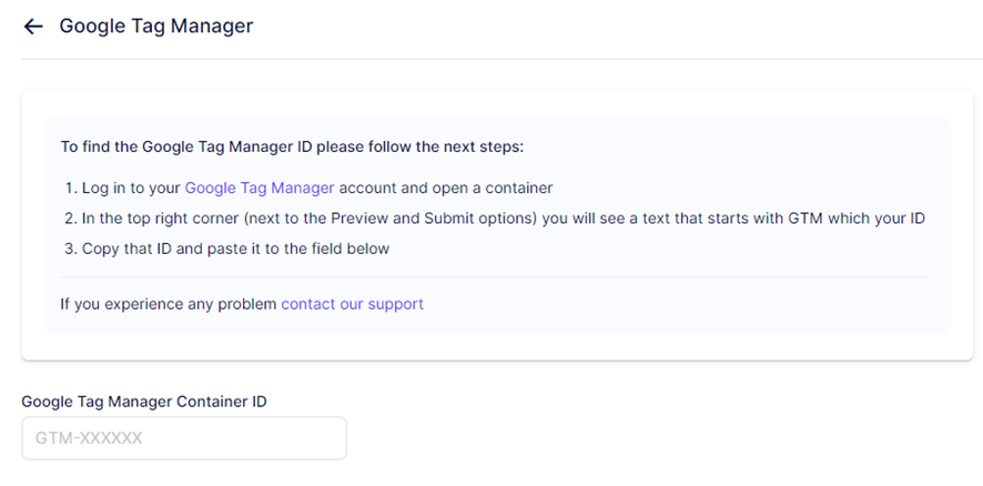 Una vez habilitado, la tarjeta se actualizará para mostrar un botón «Configurar«. Al hacer clic en este botón, se abrirá una nueva página con instrucciones sobre cómo encontrar su ID de contenedor de Google Tag Manager. Una vez que lo localice, simplemente péguelo en el campo designado como se muestra en la imagen a continuación.