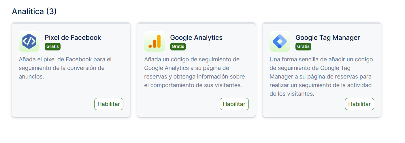 Para habilitar esta integración, vaya a la sección Características e integraciones dentro de Reservify. Localice la integración de «Google Tag Manager» y actívela con un simple clic en el botón «Habilitar«.