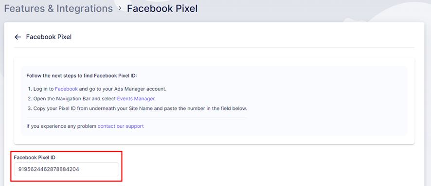 Después de habilitar la integración, la tarjeta se actualizará para mostrar un botón ‘Configurar‘. Al hacer clic en este botón, se abrirá una nueva página con instrucciones sobre cómo encontrar su ID de Facebook. Una vez que tenga su ID de Facebook, simplemente péguelo en el campo designado como se muestra en la imagen a continuación.