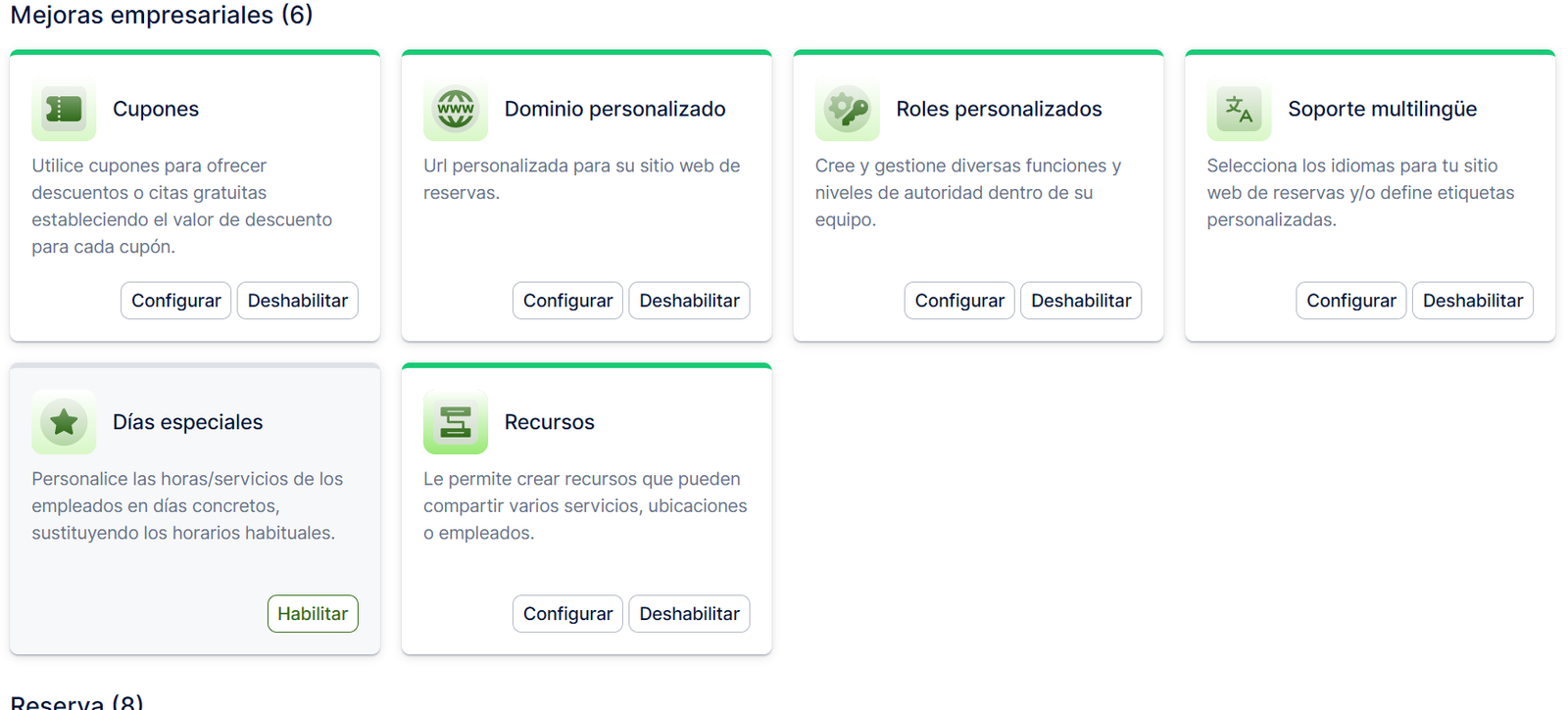 La  función Recursos de Reservify se considera una función premium y se tendrá en cuenta para el número total de funciones personalizadas e integraciones. Solo está disponible con el plan Escalado.