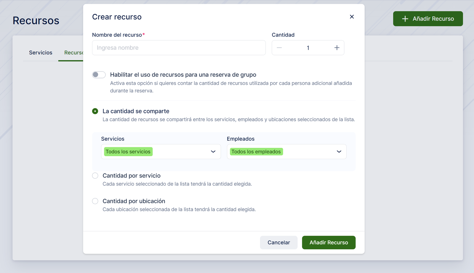 La cantidad es compartida : se utiliza si el recurso configurado se comparte para todos los empleados, ubicaciones y servicios seleccionados